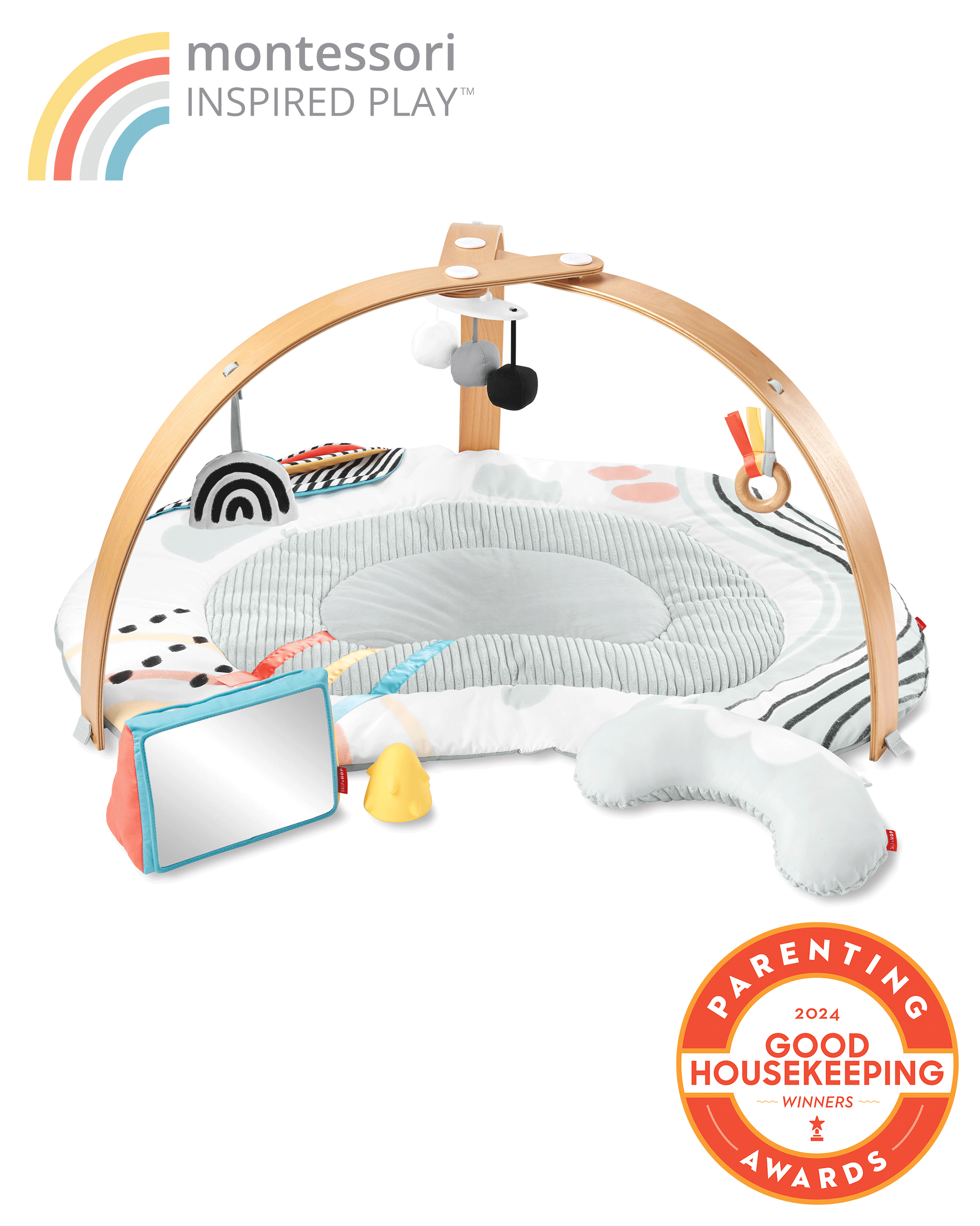 Designed in collaboration with experts in Montessori education, our Discoverosity Play Gym offers a balance of calming simplicity and an engaging sensory environment to nurture baby’s natural curiosity and development—from vision and concentration to fine motor skills and more. Crafted with sustainably-sourced wooden arches and a plush sensory playmat, the five nature-inspired developmental toys include contrasting patterns, crinkle sounds, a baby mirror and more to encourage self-directed activity and exploration. Six parent cards guide you through the gym’s milestone-driven play so you and baby can discover, learn and grow together.